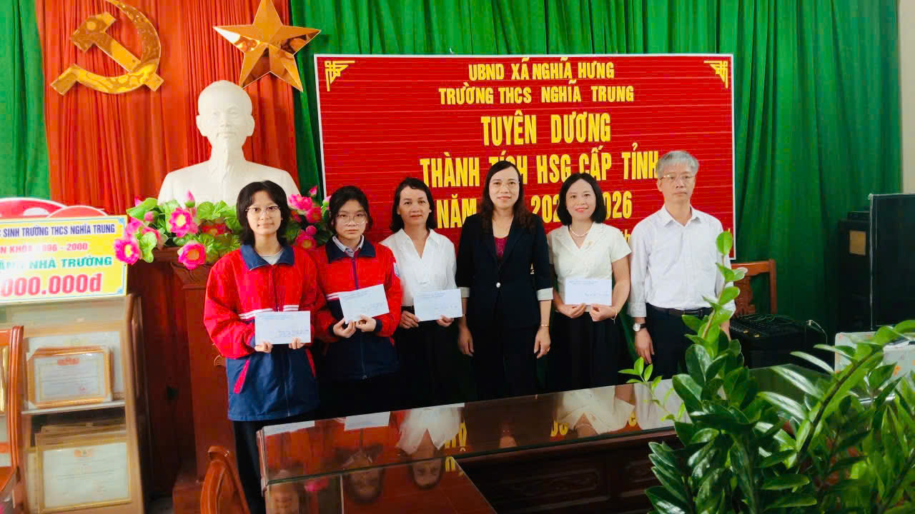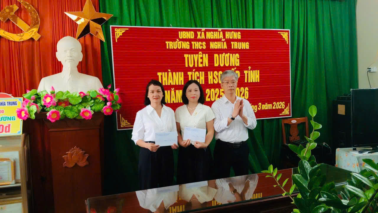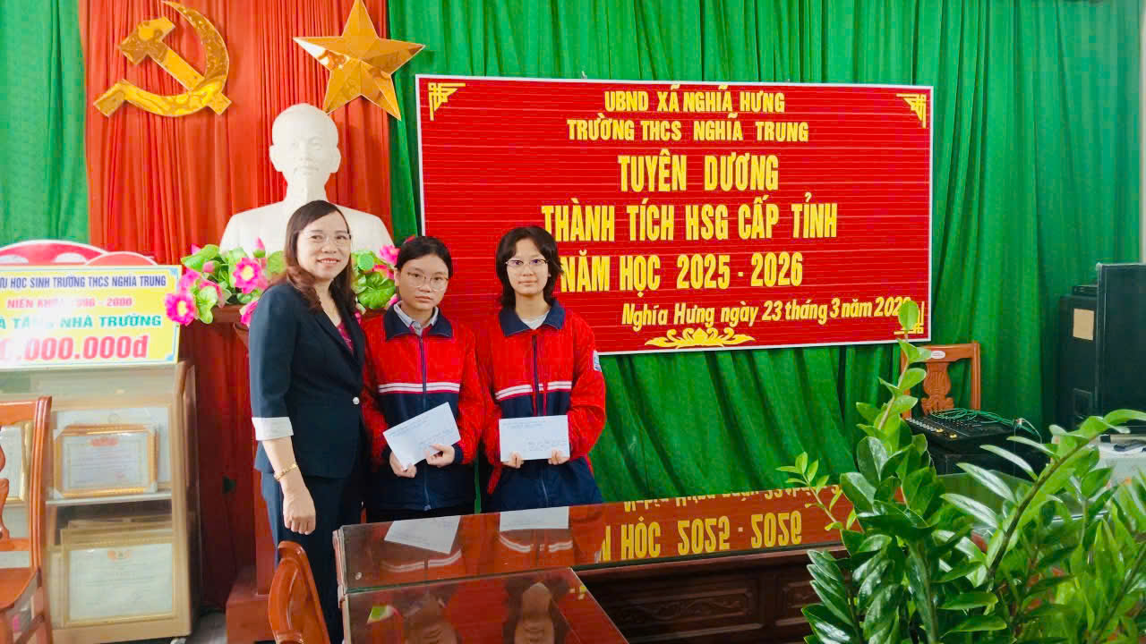 Ngày 23/3/2026, Trường THCS Nghĩa Trung đã tổ chức buổi gặp mặt, tuyên dương và khen thưởng các học sinh đạt thành tích trong kỳ thi học sinh giỏi cấp tỉnh năm học 2025–2026.